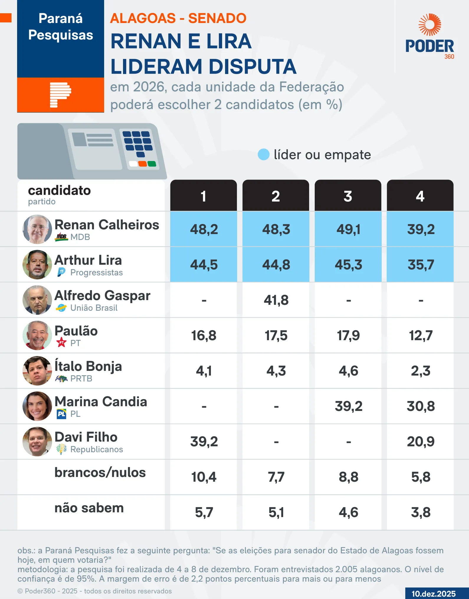 De acordo com o instituto, Renan e Lira aparecem empatados dentro da margem de erro em três dos quatro cenários simulados. No cenário 3, há um empate técnico pela segunda posição entre Lira e o deputado Alfredo Gaspar (União Brasil), indicando uma disputa mais fragmentada.
