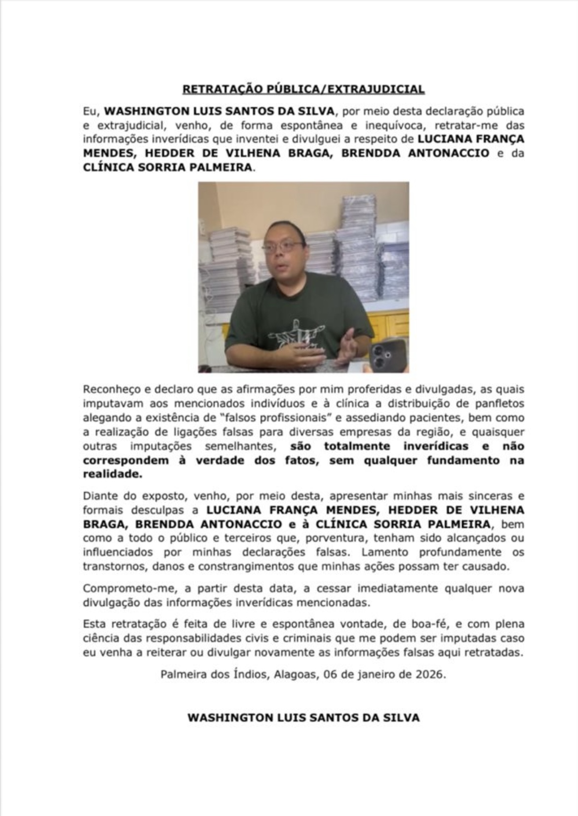 Uma retratação pública e extrajudicial foi divulgada nesta semana por Washington Luis Santos da Silva, em Palmeira dos Índios, no Agreste de Alagoas. No documento, ele admite ter inventado e divulgado informações inverídicas envolvendo os nomes de Luciana França Mendes, Hedder de Vilhena Braga, Brendda Antonaccio e da Clínica Sorria Palmeira.