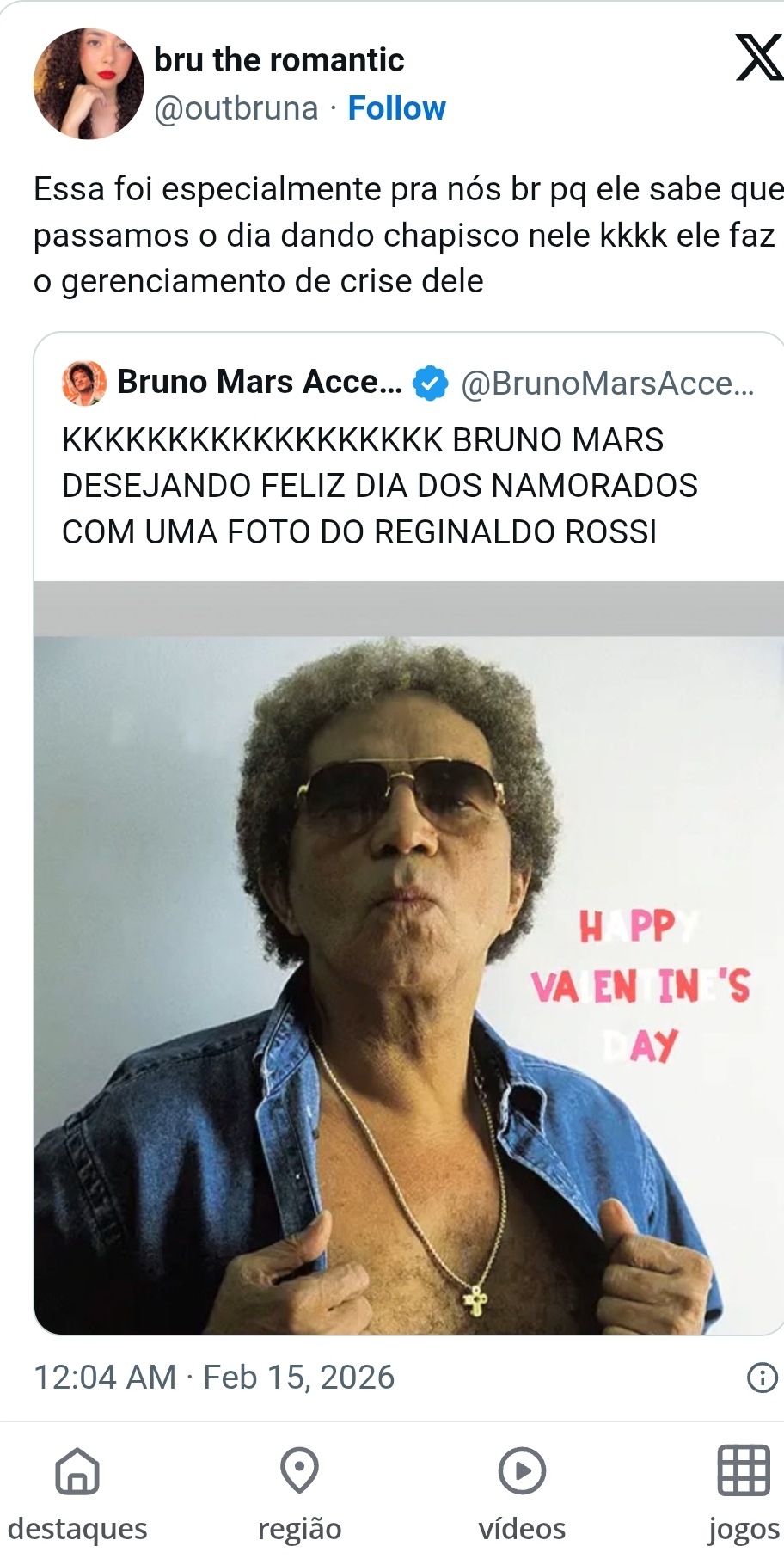 O cantor Bruno Mars surpreendeu os seguidores neste sábado (14) ao desejar “Feliz Dia dos Namorados” — data em que o Valentine’s Day é celebrado nos Estados Unidos — usando uma imagem do pernambucano Reginaldo Rossi em sua publicação.