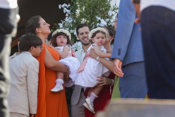 O noivo entrou na capela acompanhado da mãe, Renata Campos, ao som da música “De Janeiro a Janeiro”, enquanto a noiva surgiu ao lado do irmão, Allan, entrando ao som da marcha nupcial e, em seguida, com “Céu de Santo Amaro”.