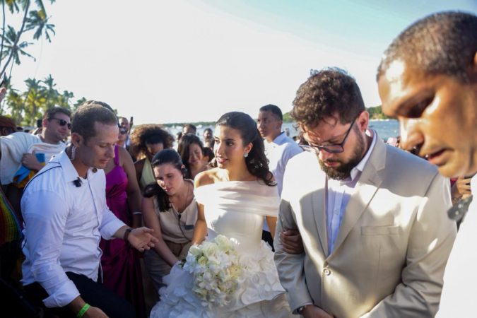 Após a celebração religiosa, os noivos recepcionam cerca de 500 convidados na Pousada Igrejinha de Carneiros, à beira-mar. Uma mesa de welcome drinks foi montada ao lado da capela para receber os convidados que participarão da celebração.
