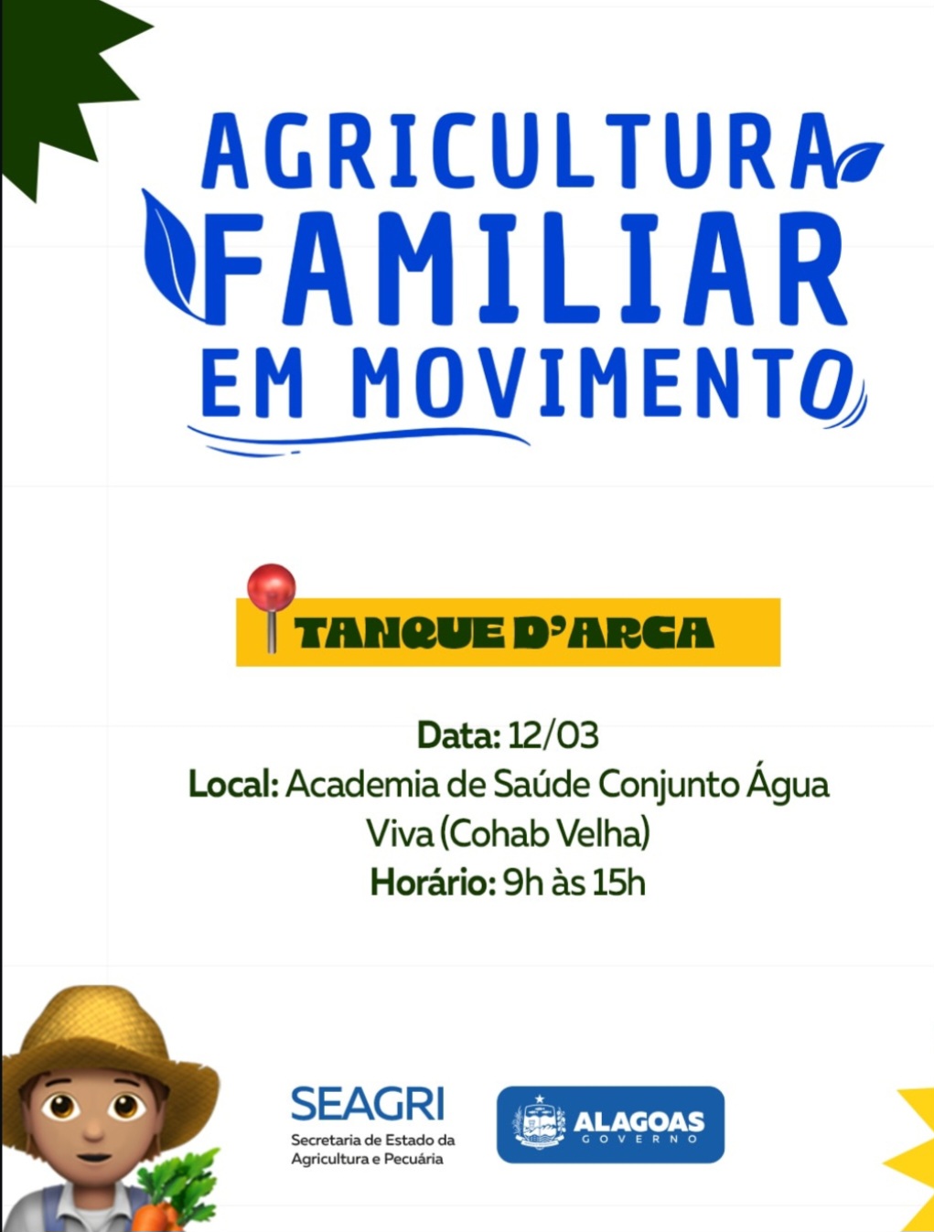 O município de Tanque d’Arca será palco de mais uma edição do projeto Agricultura Familiar em Movimento, iniciativa que leva serviços essenciais, orientação técnica e acesso a políticas públicas para agricultores familiares e comunidades tradicionais. A ação será realizada no próximo dia 12 de março, das 9h às 15h, na Academia da Saúde do Conjunto Água Viva, na Cohab Velha.