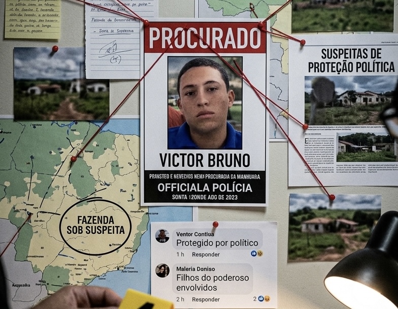Nas redes sociais, uma teoria explosiva passou a circular com força: Victor Bruno, apontado como principal suspeito de um crime grave no interior do estado, poderia estar escondido em uma fazenda ligada a um político, e não estaria sozinho.