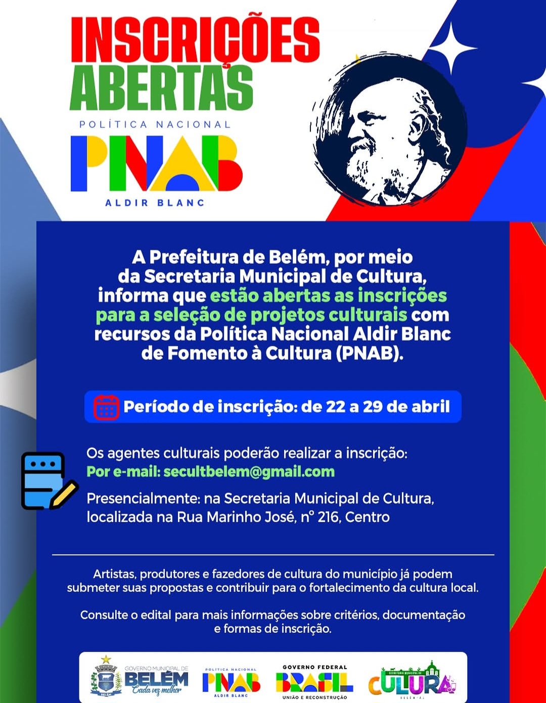 A Prefeitura de Belém, por meio da Secretaria Municipal de Cultura, abriu nesta quarta-feira (22) as inscrições para seleção de projetos culturais financiados pela Política Nacional Aldir Blanc de Fomento à Cultura (PNAB). O prazo para envio de propostas vai até quarta-feira (29).